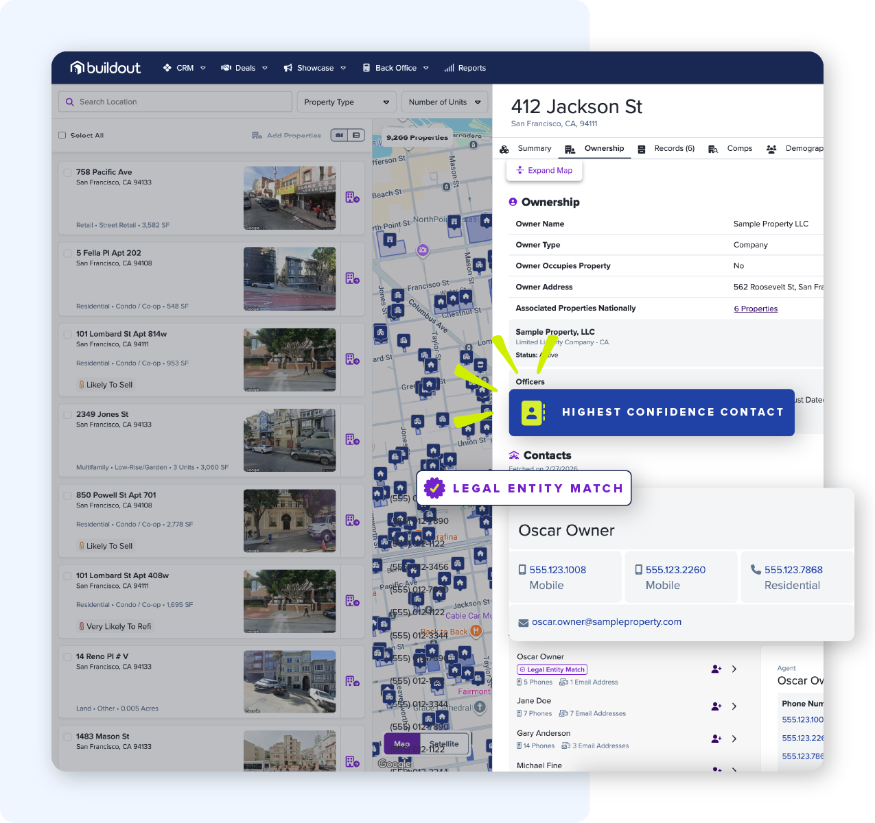 Winning listings starts with knowing who to call. Buildout CRM connects Buildout's property intelligence directly to your deal workflow, helping brokers identify likely-to-sell properties, uncover ownership contacts, and add opportunities to the pipeline in seconds.