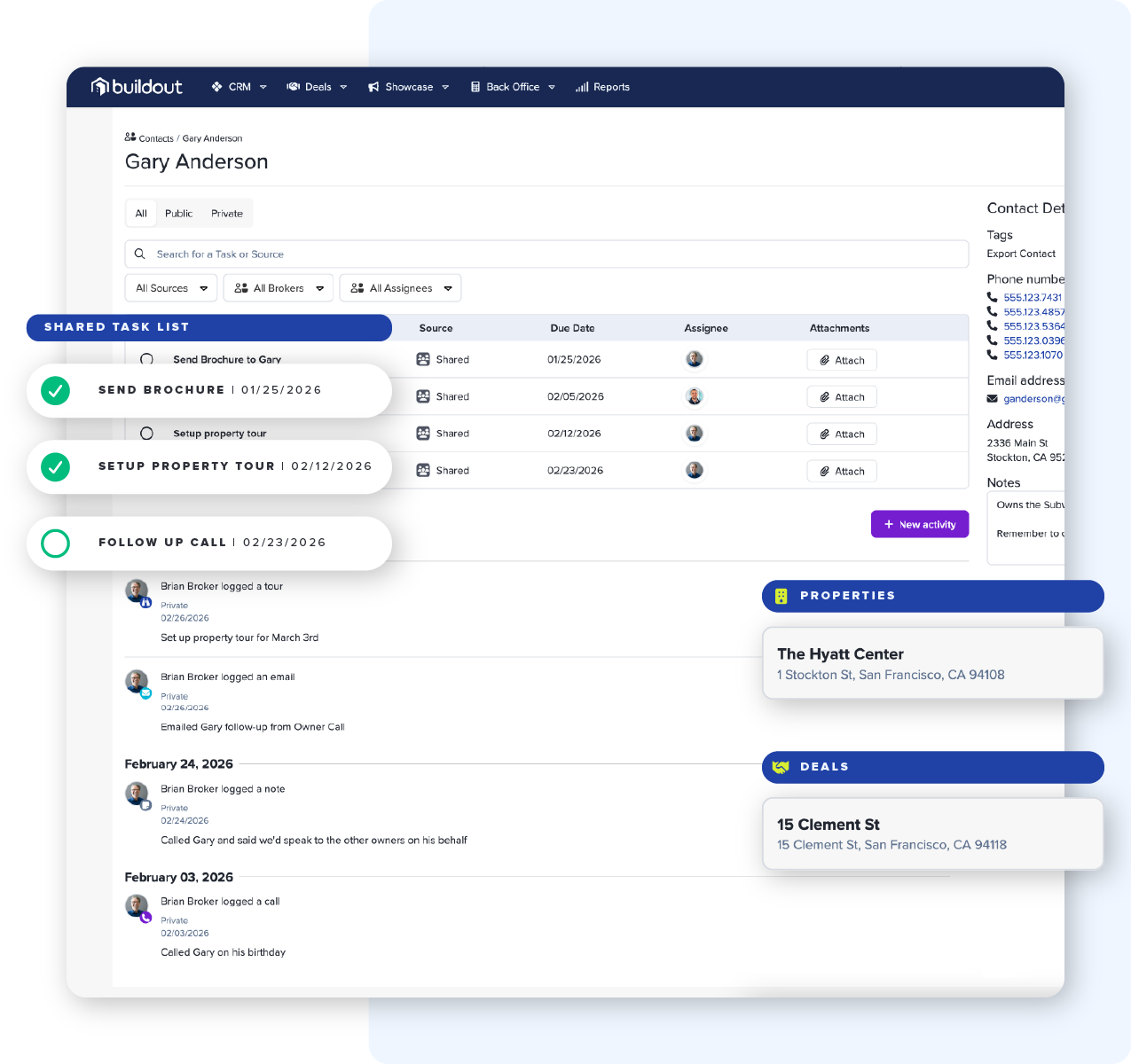 CRE relationships are complex. One owner can control multiple properties, interact with multiple brokers, and touch multiple deals over time. Buildout CRM connects every interaction so you always know where to relationship stands.